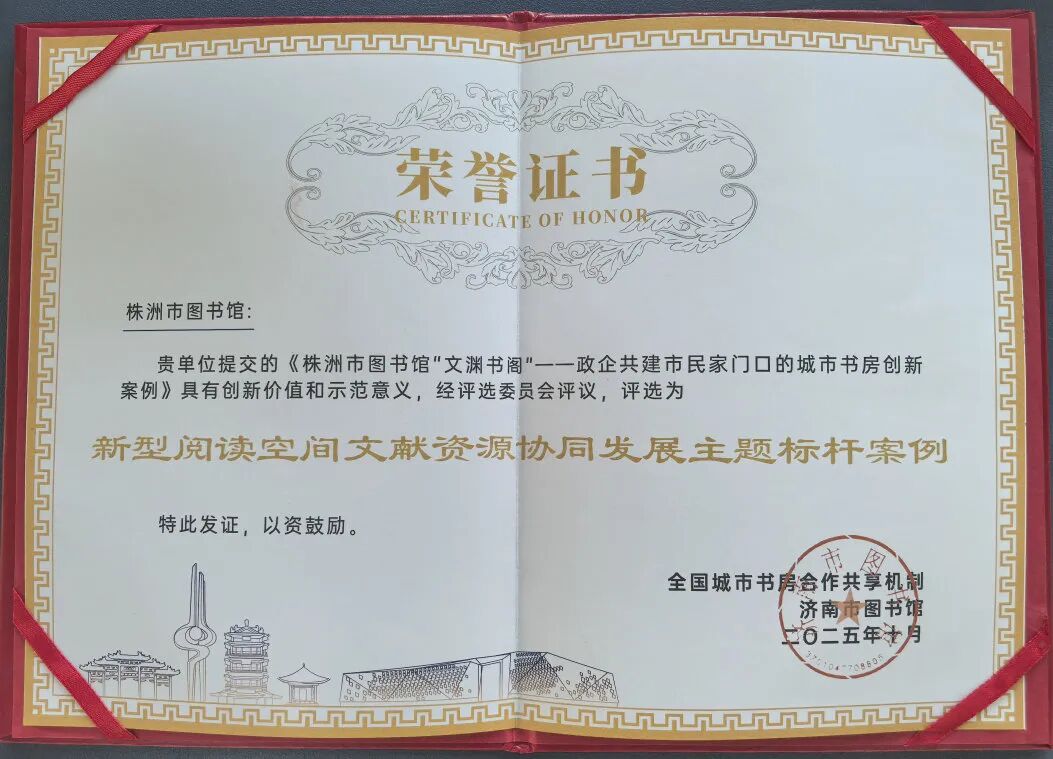 近日,株洲市圖書館與湖南高科控股集團(tuán)聯(lián)合打造的“文淵書閣”城市書房,在2025年全國城市書房合作共享機(jī)制交流活動中,榮獲“新型閱讀空間文獻(xiàn)資源協(xié)同發(fā)展主題標(biāo)桿案例”,成為政企共建文化空間的典范之作。